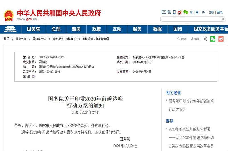 2021年10月24日,國務(wù)院發(fā)布《2030年前碳達峰行動方案》(以下簡稱《方案》),原文指出:
