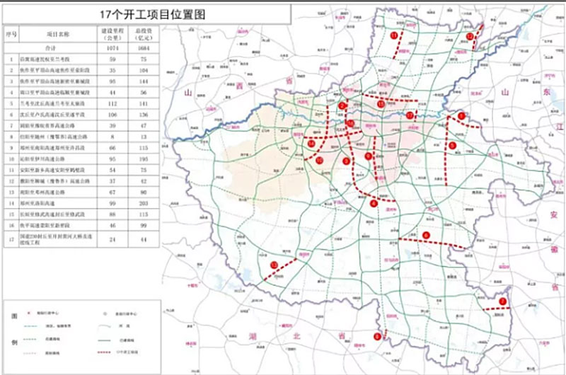 近日,河南省17個交通重點項目分別在鄭州、開封、洛陽等16個省轄市同步宣布開工建設。開工的17個項目包括16個、共1050公里的高速公路,總投資達1640億元。至此,河南省高速公路建設項目達到53個,3390公里,總投資高達4556億元。