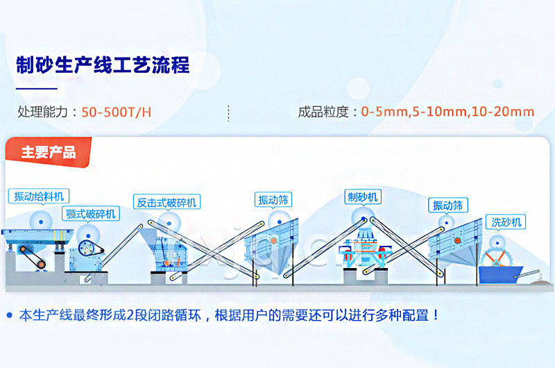 石料由振動(dòng)給料機(jī)送至顎破進(jìn)行粗碎,粗碎后的物料送至圓錐破或反擊破進(jìn)行再次破碎,破碎后的石料通過輸送機(jī)送進(jìn)振動(dòng)篩進(jìn)行篩分,滿足制砂機(jī)進(jìn)料粒度的石料進(jìn)入制砂機(jī)進(jìn)行制砂,不滿足要求的返回圓錐破或反擊破重新進(jìn)行破碎。從制砂機(jī)出來的石料,再次進(jìn)入振動(dòng)篩內(nèi)進(jìn)行篩分,篩分出滿足要求的機(jī)制砂,進(jìn)入洗砂機(jī)清洗,清洗后由成品輸送帶輸送即為成品;不滿足要求的砂石混合物料,送入制砂機(jī)進(jìn)行再次破碎。