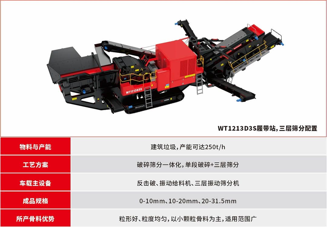 如西安客戶選用的為兩層篩的履帶站(WT1213DS,篩分規(guī)格:0-10mm、10-50mm),相應(yīng)篩分出0-10mm、10-50mm兩種規(guī)格的骨料,還有三層篩的履帶站(WT1213D3S,篩分規(guī)格:0-10mm、10-20mm、20-31.5mm)可供客戶選擇。