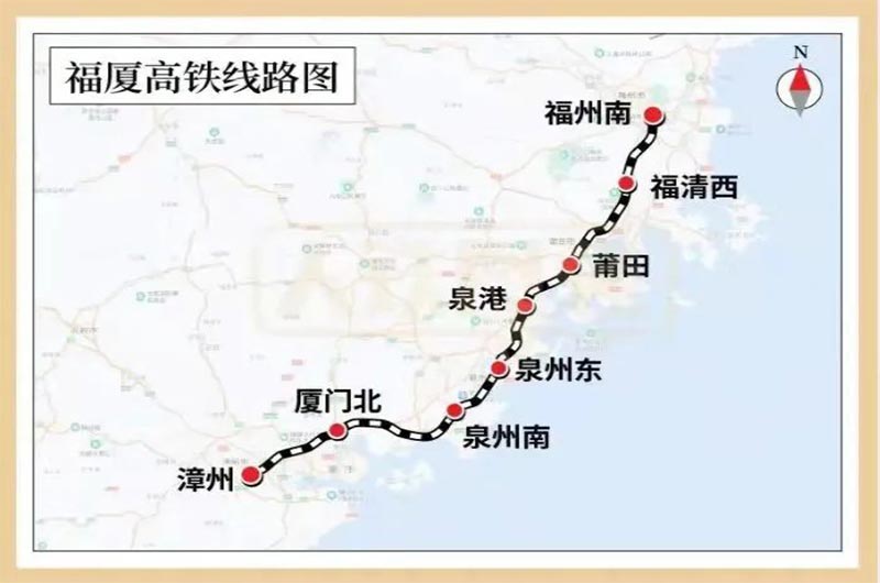福廈高鐵線路北起福州市,南至廈門和漳州市,全長277.42公里,設(shè)計(jì)時(shí)速350公里,共設(shè)福州南、福清西、莆田、泉港、泉州東、泉州南、廈門北、漳州8座車站。