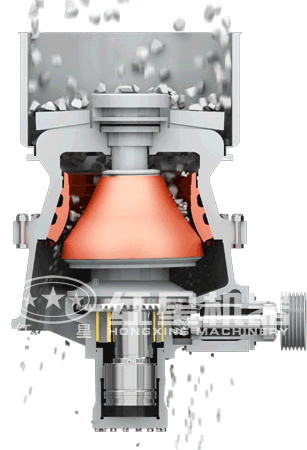 單缸圓錐破碎機(jī)工作時:電機(jī)帶動破碎機(jī)的小齒輪,小齒輪帶動大齒輪,大齒輪組件(大齒輪、大齒輪架、偏心鋼套)帶動偏心套組件(偏心缸套、偏心銅套)和主軸組件(主軸、內(nèi)錐、內(nèi)錐襯板)以理論垂直線為中心,在銅襯套內(nèi)公轉(zhuǎn),主軸組件在偏心銅套內(nèi)以主軸的中心線可以實(shí)現(xiàn)自轉(zhuǎn)??諜C(jī)運(yùn)行的時候,偏心套組件“抱著”主軸組件和隨大齒輪一同公轉(zhuǎn),當(dāng)物料加入到破碎腔后,主軸總成(主軸、內(nèi)錐)在物料的阻力下在偏心銅套內(nèi)緩慢的自轉(zhuǎn)。內(nèi)錐的運(yùn)行軌跡看起來是在破碎腔內(nèi)來回?cái)[動,同時緩慢的旋轉(zhuǎn)。物料被擺動的內(nèi)錐擠壓破碎。支撐套與架體連接處靠液壓缸壓緊,當(dāng)破碎機(jī)內(nèi)落入金屬塊等不可破碎物體時,單缸的動錐由底部液壓活塞托起,起到排放口調(diào)整和過鐵保護(hù)、反復(fù)起落排除堵礦的作用。